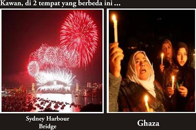 Walaupun saya tidak merayakan tahun baru dengan barbeque, kembang api, jalan-jalan, maupun gemerlap dunia malam, namun saya sedikit malu dengan sikap saya terhadap tahun baru 2009 ini. Saya menyelamati orang-orang dengan ucapan selamat tahun baru. Berbagi cerita dan kebahagiaan dengan teman-teman yang merayakan. Tapi gambar di atas cukup menusuk perasaan saya. Saya jadi malu bisa-bisanya tersenyum bahagia di saat saudara-saudara kita sedang dalam kondisi kritis. Semoga saudara-saudara kita diberi kekuatan dan ketabahan. Mari teman-teman kita bantu sodara seiman kita.