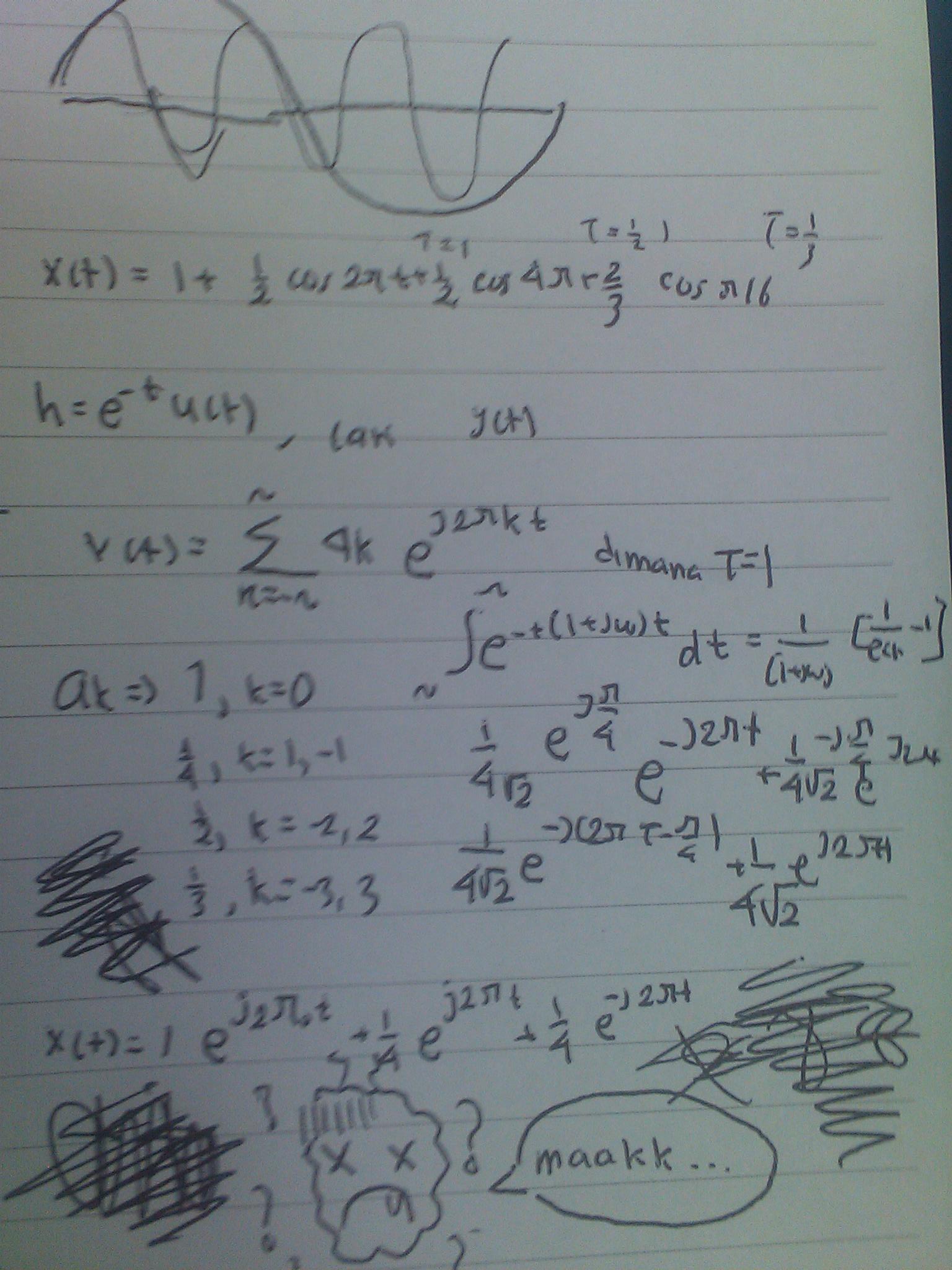 Semester satu, saya mendapatkan mata kuliah kalkulus I dan kalkulus II saya dapatkan di semester dua. Kemudian di semester tiga ada yang namanya matematika teknik. Sekarang di semester empat pada dasarnya tidak ada mata kuliah yang benar-benar menyentuh bahasa matematis. Namun ada satu mata kuliah yang masih mengimplementasikan sifat-sifat dan kemampuan bahasa matematis untuk dapat memahami mata kuliah tersebut, yaitu mata kuliah sinyal dan sistem. Mata kuliah ini cukup menantang karena setiap pelajaran, papan tulis selalu dihujani dengan sederetan lambang integral dan diferensial, lalu huruf e, j, dan w bertebaran dimana-mana, serta pangkat dan bilangan matematika yang rumit lainnya bermunculan di papan tulis. Karena daya tangkap terhadap sifat dan rumus matematika saya kurang bagus, alhasil saya mengalami kesulitan dalam mengejar pelajaran tersebut di dalam kelas. Di luar kelas saya masih berkesempatan untuk mempelajarinya lebih dalam dan bertanya kepada teman-teman saya. Tapi ketika di kelas, bisa dibayangkan betapa serunya pertarungan antara rumus-rumus di papan tulis dengan kesadaran saya secara jiwa dan raga.