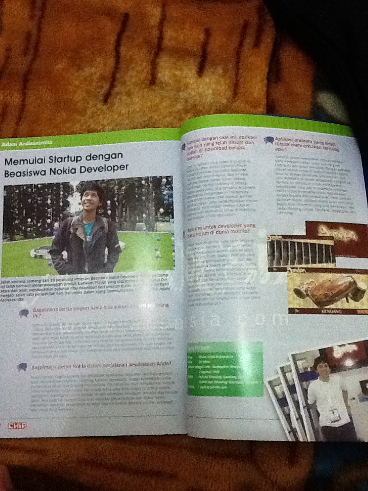 Bulan ini baru saja diluncurkan majalah CHIP edisi spesial dengan judul “how to get rich with mobile apps”. Pada edisi tersebut, kebetulan saya diwawancara untuk mengisi rubrik mengenai success story menjadi developer mobile melalui Nokia Developer Scholarship Program.
