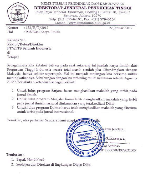 Dalam sistem hukum di RI, produk hukum yang bersifat mengikat, mewajibkan, adalah UU dengan turunannya berupa Peraturan Pemerintah, Peraturan Menteri; serta Peraturan Daerah. Surat Dirjen itu tidak memiliki dasar hukum karena itu tidak bisa digunakan untuk membatalkan kelulusan wisudawan hanya gara-gara belum melakukan publikasi ilmiah.