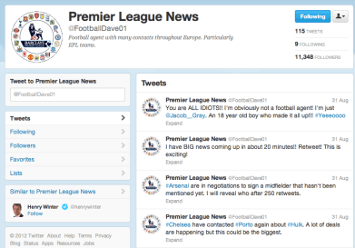 Di saat saya sedang asyik mengikuti bocoran dari agen, salah seorang agen twitter yang berakun @FootballDave01 membuat sebuah status twitter yang menggemparkan. Dia bilang klo kita semua sudah ditipu, dia hanyalah seorang bocah berumur 18 tahun yang sedang bermain-main dan menipu kita semua. Awalnya hanya iseng-iseng, tapi karena banyak yg nanggepin serius, jadi deh dia lanjutin. Eh, malah muncul agen2 jadijadian lainnya. Wew, saya pun heran dan punya dua spekulasi. Yang pertama dia beneran cuma agen palsu yang berusaha mencari info dari berbagai forum dan gosip lalu segera dia tweet, atau dia beneran agen yang dituntut dan diancam karena membocorkan konten rahasia ke publik (sehingga harus mengaku-ngaku anak umur 18 taun yg lagi iseng). Siapapun dia, agen-agen itu telah sukses membuat para fans bola dag-dig-dug dengan info-info transfernya 🙂