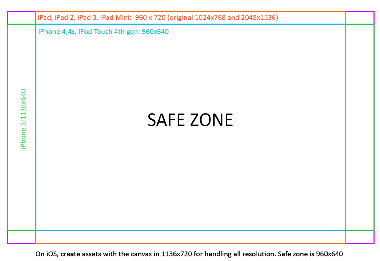 Dengan cara tersebut, gambar yang telah dibuat tidak akan mengalami stretching yang membuat gambar jadi terlihat tidak proporsional. Elemen tambahan hanya akan muncul jika terdeteksi resolusi yang berbeda. Gambar di bawah adalah guideline safe zone yang bisa digunakan.