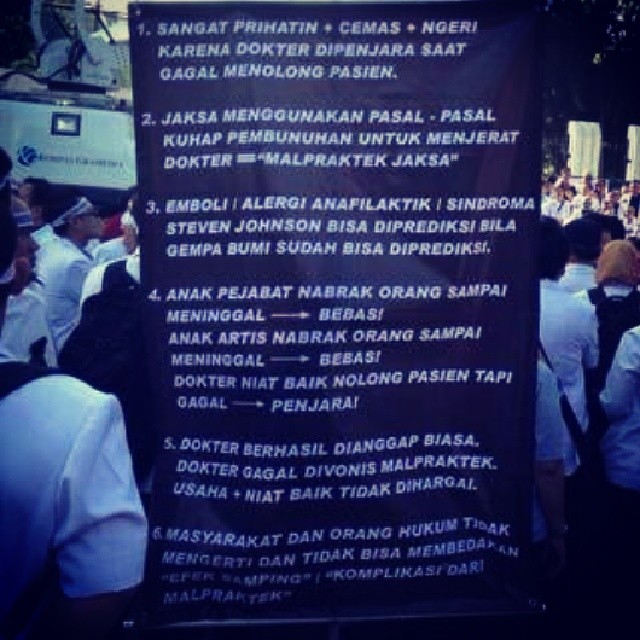 Banyak sekali kasus dimana dokter kita ini dijadikan korban. Mulai dari kasus politik, dimana para calon pejabat seenak udel menjanjikan kesehatan gratis tapi tidak memikirkan sistem, sarana, dan fasilitas kesehatan. Uang yang tadinya dijanjikan untuk kesehatan, ujung2nya dikorup sehingga yang sampai langsung ke fasilitas kesehatan tidak memadai. Alhasil, ketika fasilitas kesehatan tidak mampu melayani, yang jadi korban adalah para dokter. Dianggap matre, dianggap tidak mau memberikan pelayanan terbaik, dan sebagainya. Lalu tak lama, ada lagi kasus dimana ada pasien yang tidak menghargai dokter sampai menyiram kopi. Di media massa santer dikatakan bahwa dokter tersebut main HP dan tidak memberikan pelayanan yang optimal. Media massa ramai menyudutkan dokter, hingga pada akhirnya fakta terkuak sebaliknya. Si dokter mengeluarkan HP untuk menangkap bukti perkataan pasien yang kurang santun. Banyak sekali kasus lainnya dimana posisi dokter disudutkan oleh kesalahan pihak lain. Selama ini, dokter diam. Mereka tidak punya energi untuk mengurusi hirup pikuk media, hukum, dan politik. Mereka hanya bisa mengadu kepada pemerintah tentang kondisi ini, yang nampaknya responnya kurang tanggap. Kemudian, ada satu kasus yang membuat para dokter ini harus menegur masyarakat, media, dan pemerintah dimana profesi dokter sudah terlalu dikorbankan, yakni kasus dimana ada seorang dokter yang dipenjara karena dianggap tidak memberikan pelayanan dengan baik.
