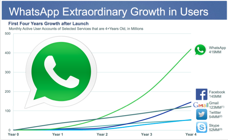 Kita coba lihat pencapaian whatsapp sejauh ini. Dari segi pengguna, WA sudah memiliki 450jt pengguna aktif perbulannya. Mereka juga memiliki pertumbuhan hingga 1 juta pengguna baru perhari. Belakangan, WA telah memiliki volume pengiriman pesan yang menyaingi pengiriman pesan melalui SMS di seluruh dunia. Pertumbuhan WA yang sangat masif ini tentu menjadi daya tarik tersendiri bagi berbagai perusahaan dan investor. Tapi menurut saya pribadi, satu hal yang masih membuat saya bingung adalah kemana arah gerak monetisasi dari Whatsapp ini? Dari awal, mereka sudah menetapkan bahwa WA tidak akan memasukan iklan, tidak akan menggunakan game, ataupun gimmick seperti yang selama ini sudah Line, KakaoTalk, dan WeChat lakukan. Mereka punya model subscribe pertahun 0.99 dolar. Tapi kok sejauh ini, saya udah make WA beberapa tahun, tidak pernah ada tagihan apa-apa? Lalu, apa yang membuat FB memutuskan membeli WA jika saat ini belum ada revenue yang cukup besar?