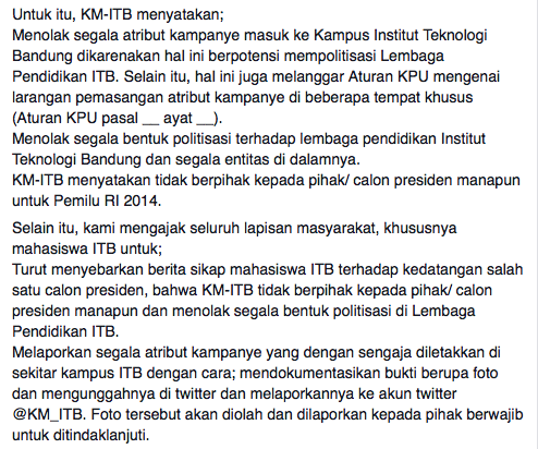Surat edaran dari KM ITB MAJALAH GANESHA (diklarifikasi oleh senator HMIF) menyikapi kedatangan Jokowi