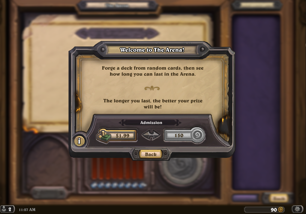 Kemudian agak berbeda dengan yang di menu “Play,” ada juga menu “The Arena.” Bermain di Arena ini sistemnya adalah survival. Kita akan membayar tiket masuk ke Arena (150 koin atau bayar via IAP), lalu kita akan memilih deck yang pilihan kartunya dibuat dengan mode suggestion, lalu kita harus terus memenangkan tiap game dengan deck tersebut. Kita hanya diberikan tiga kali kesempatan untuk kalah dalam permainan. Jika telah tiga kali kalah, maka berakhirlah Arena kita. Tapi, tiap kali menang, kita akan mendapatkan “key” yang semakin bagus untuk membuka reward dari Arena. Reward tersebut akan kita dapatkan setelah kita selesai Arena. Saya sendiri belum cukup pede untuk main di Arena mengingat saya belum menguasai semua heroes dan kartu-kartu spesial mereka, jadi sekarang saya masih fokus di levelling masing-masing heroes dan meningkatkan koleksi kartu saya. Di Youtube banyak sekali video-video Arena yang sangat seru untuk disaksikan 🙂 Makanya saya tahu kalau set kartu dan skill saya masih belum sampe :p hehehe