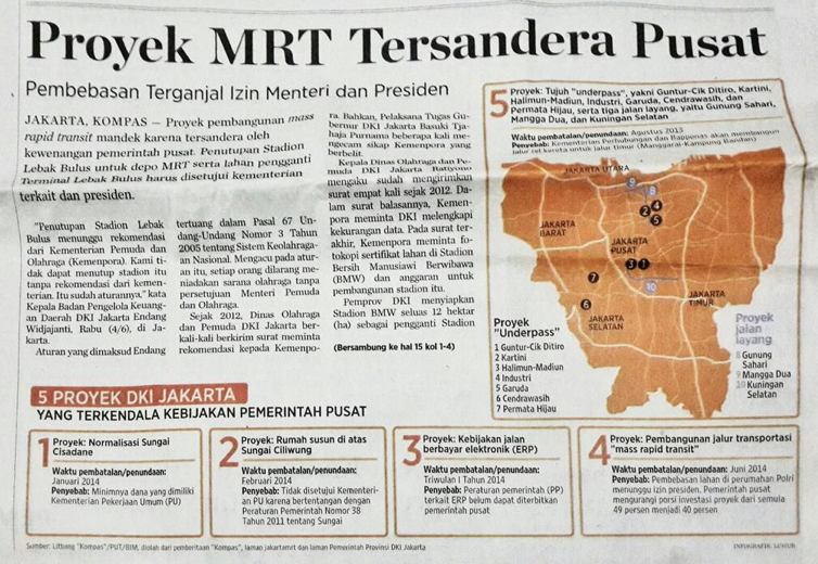 - Untuk membangun MRT, Jakarta perlu dukungan yang besar dari pusat terkait dengan pembebasan lahan, penutupan stadion lebak bulus yang mana butuh surat rekomendasi dari menpora, dan banyak juga dengan kementrian terkait lainnya, tapi proses ini berjalan sangat lama dan tidak jelas.