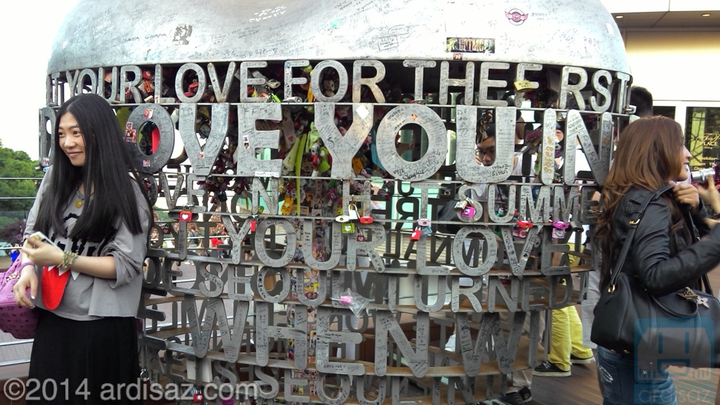 Saya menemukan spot paling pas untuk foto di depan namsan tower. Kalau kita foto di deket towernya, kita gak bias ambil gambar towernya sampai atas. Kita musti jalan dikit ke bawah, tempat ada kafe2, nah itu tempat yang paling pas buat bisa nangkep satu tower penuh. hehehe. Lalu di sini salah satu spot yang cukup populer adalah pager untuk nempel gembok couple. Banyak pasangan yang nulis nama mereka di gembok dan naro gembok di situ. Kami tidak masang gembok sih, soalnya udah bawa terus ketinggalan di hotel :p Jadinya kami nyobain yang namanya love tile, itu modelnya kayak ubin gitu di tempel di tembok, jadi bisa naro tulisan-tulisan juga di situ. hehehe