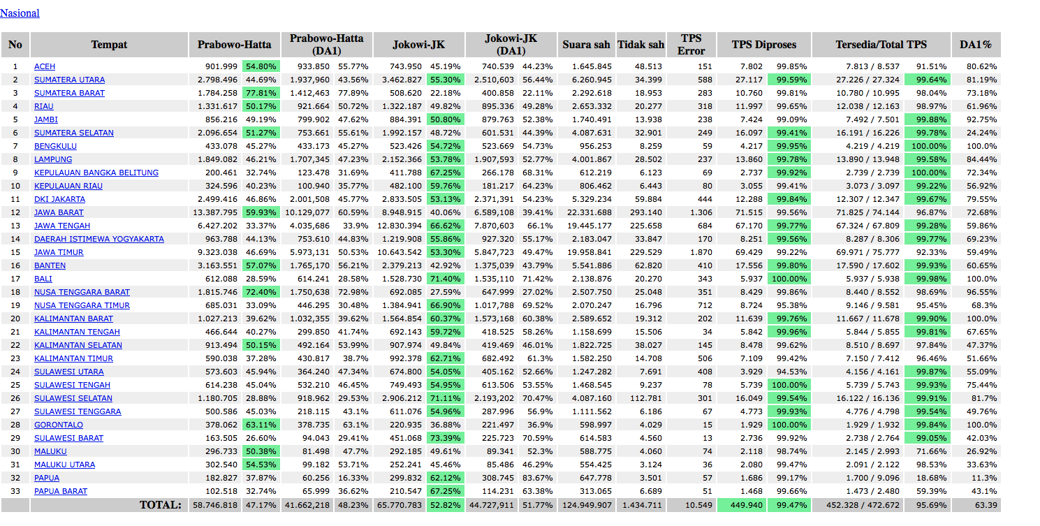 Satu lagi terobosan besar dari KPU untuk pemilu kali ini adalah transparansi. KPU memberikan akses kepada masyarakat untuk bisa melihat secara langsung hasil scan dari formulir C1 yang merupakan hasil dari pemilihan di tiap TPS yang ditandantangani oleh panitia dan para saksi beserta total perolehan suaranya. Ini menurut saya adalah langkah besar bagi transparansi birokrasi di Indonesia dan bukti bahwa KPU berada di posisi yang netral dan siap dikritik oleh masyarakat. Namun memang karena keterbatasan bandwidth, proses scanning C1 ini memang membutuhkan waktu yang tidak sebentar, jadi pertanyaan internet cepat untuk apa yang dilontarkan oleh menkominfo kita itu sangatlah tidak relevan.