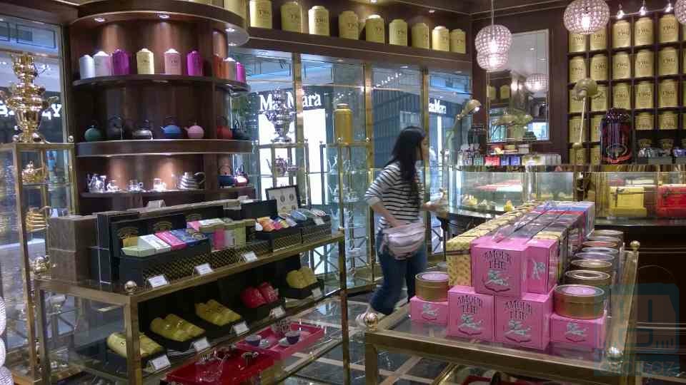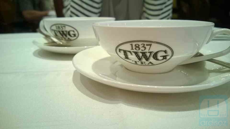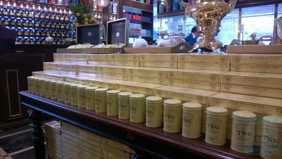 Letak TWG ada di lantai dasar, dekat dengan Sogo. Begitu masuk, langsung keliatan koleksi teh yang mereka miliki dengan berbagai jenis teh dan harga. Setengah dari toko itu dijadikan semacam kafe untuk menikmati teh. Saya dan istri langsung mencoba untuk merasakan teh langsung di sana.