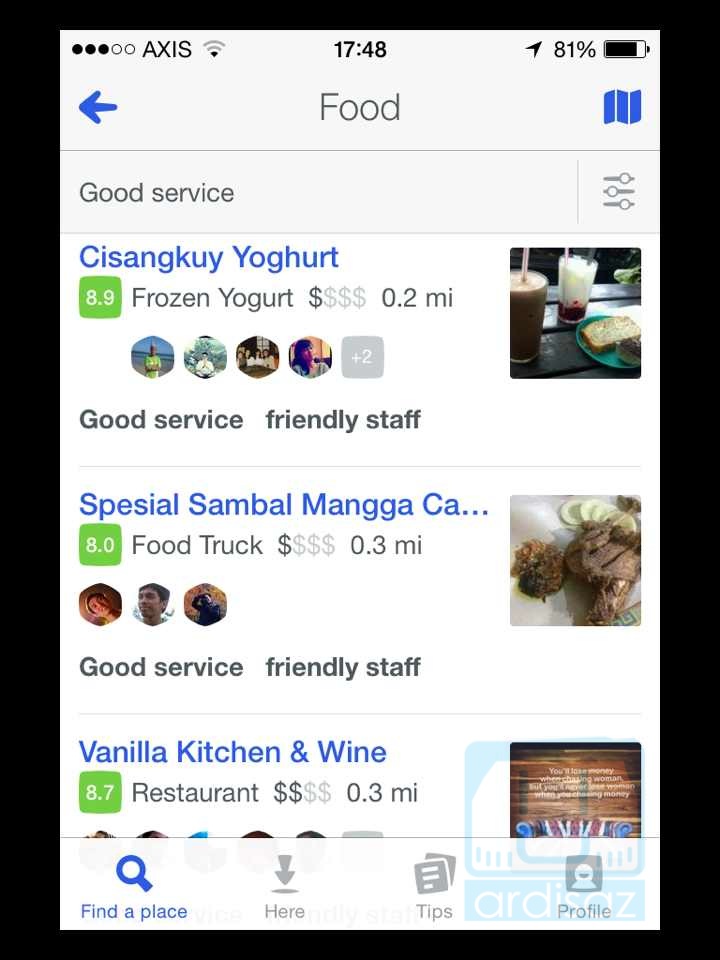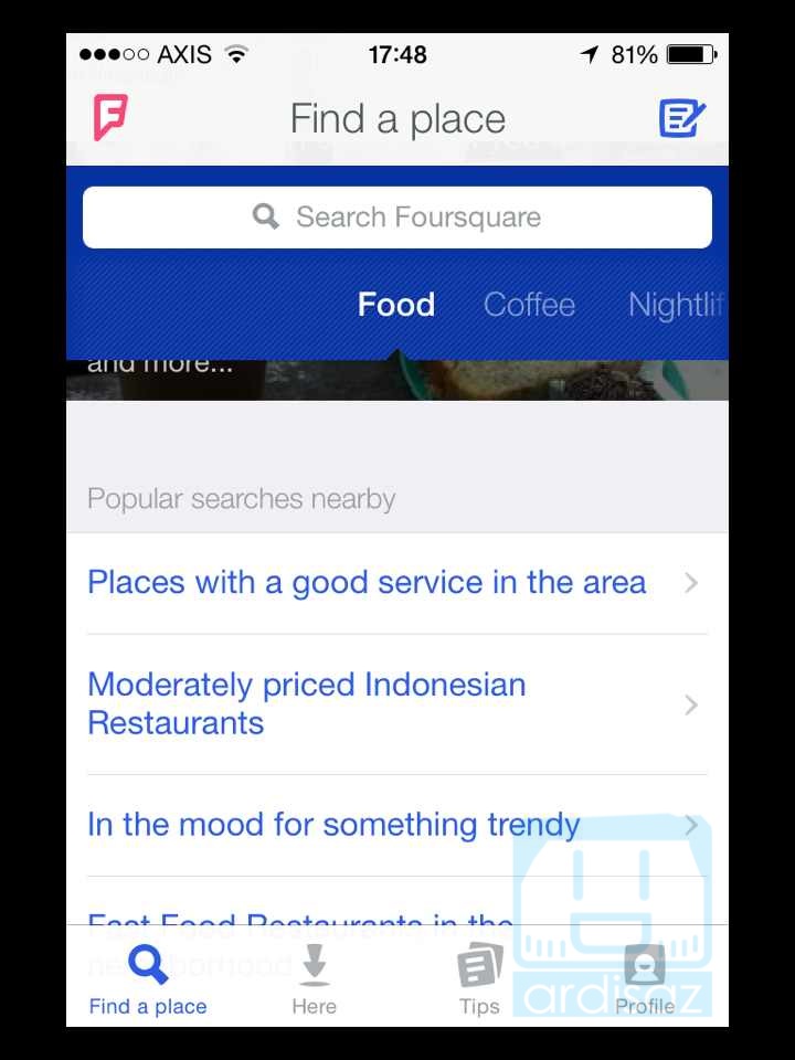 Kalau Foursqare yang dahulu fokus terhadap fitur chek-in, kali ini tombol tersebut tidak lagi muncul di halaman depan. Kini halaman depan penuh dengan konten-konten rekomendasi untuk kita mencari tempat makan, belanja, dan lain-lain. Tidak ada lagi foto teman-teman kita beserta poin yang ia miliki dari hasil checkin, bahkan kita tidak bisa lagi checkin menggunakan foursquare. Untuk checkin, kita akan diminta untuk mengunduh dan menggunakan aplikasi Swarm yang lebih fokus untuk menemukan teman yang sedang berada di sekitar kita.