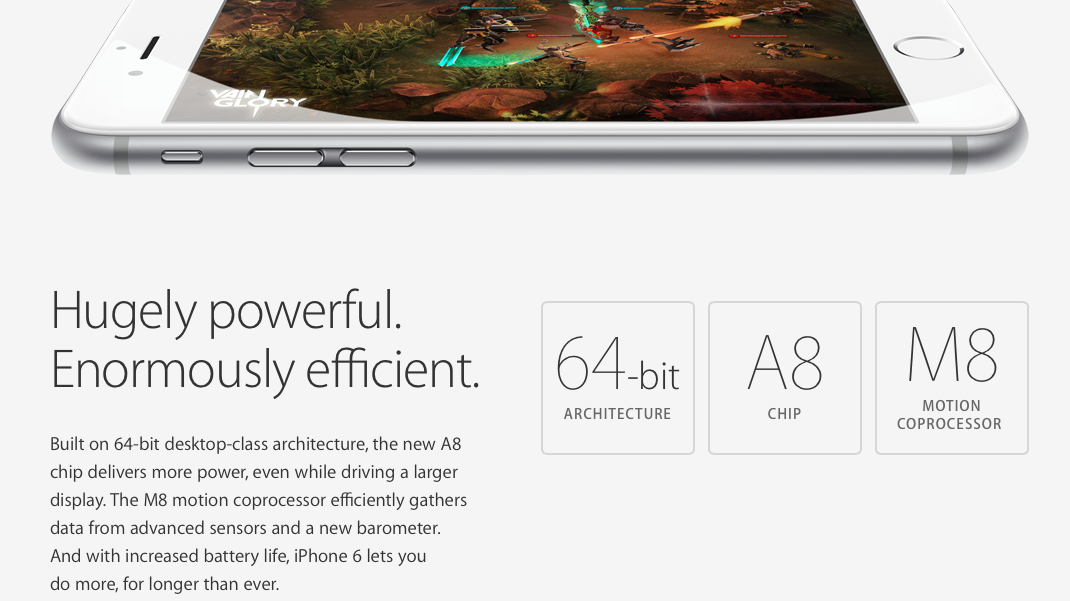 Apple menambahkan banyak pembaruan untuk hardware di dalamnya. Mulai dari arsitektur 64 bit (agak sedikit ketinggalan dari sih klo ini), lalu chipnya diperbaharui dengan nama A8 yang memberikan performa komputing yang lebih tinggi dari sebelumnya, dan yang menarik adalah adanya sensor motion yang bernama M8. Dengan sensor ini, iPhone bisa mendeteksi ketinggian misalnya ketika kita naik/turun tangga. Data ini bisa digunakan untuk lebih memperkuat fitur aplikasi kesehatan dan olahraga yang dimiliki oleh iPhone.