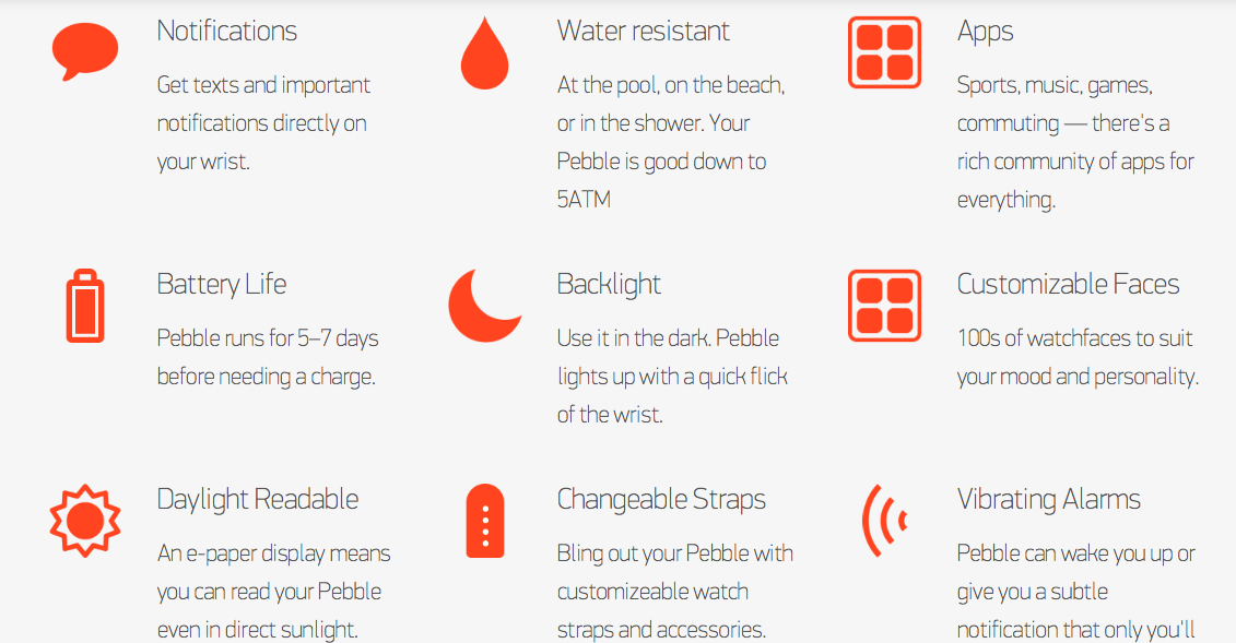 Pebble terdiri dari dua jenis, Pebble biasa (terbuat dari bahan plasti) dan Pebbel Steel (terbuat dari besi). Harga Pebble 150 dolar dan Pebble steel 249 dolar. Fitur dan hardware keduanya sama persis, bisa pairing dengan smartphone, mendapatkan notifikasi, mengganti-ganti tampilan jamnya, menginstal apps di jam tangan untuk mensupport smartphonenya, dan lain-lain. Di dalam satu Pebble, kita hanya bisa menginstal 8 apps atau tampilan jam demi menghemat batre.
