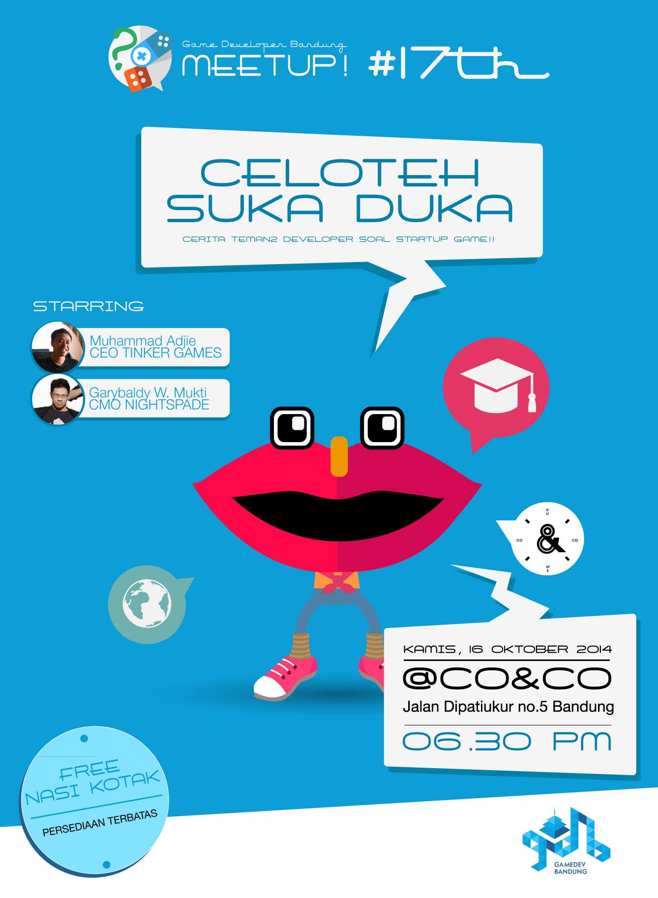 Meetup GameDevBdg community bulan lalu kelewat nih, jadinya baru bisa dilakukan awal bulan Oktober. Meetup kali ini rencananya pengen bikin sesi yang santai-santai saja, ngebahas suka duka menjadi developer game. Pembicara utamanya Aji dari Tinker dan Gerry dari Nightspade, tapi konsep awalnya sih pengen santai aja kalau ada yang mau sharing-sharing lagi bisa langsung aja diskusi terbuka.