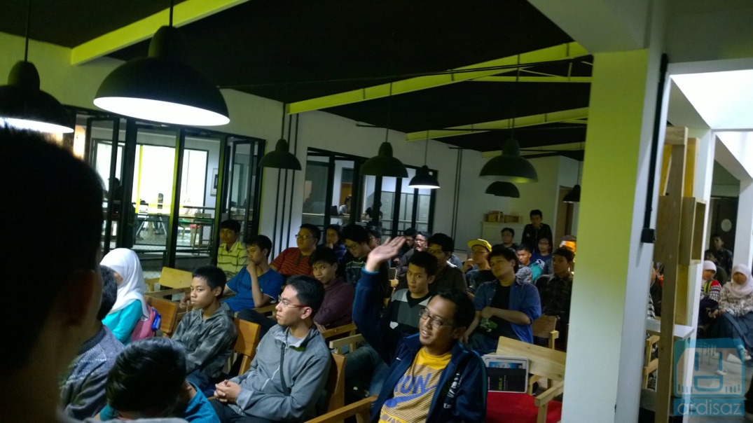Saya sendiri kebetulan datangnya agak telat, biasa meetup dimulai jam 7 malam, saya datang sekitar jam 8 kurang. Biasanya, peserta meetup game developer bandung paling hanya 30-40 orang, maksimal ya 50 orang lah. Bahkan dulu awal-awal cuma 10-20 orang :p Ini pas saya dateng ke lokasi, saya cukup shock melihat pesertanya yang mungkin mencapai 60 orang. Rame banget sampe banyak yang gak kebagian kursi. Lalu uniknya, setengah peserta yang datang merupakan siswa SMK 🙂 Seneng banget klo meetupnya rame gini dan banyak darah muda yang sangat semangat.