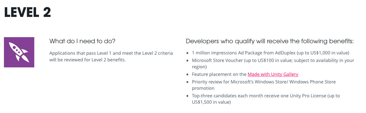 Abis itu belum ada kabar lagi apakah bisa lolos ke level 2. Kalau dilihat dari showcase di halaman webnya, kok yang menang level 2 kaliber-kaliber semua yah gamenya :p (coba aja ditengok di web ini). Game Arsanesia belum sampe situ kayaknya tarafnya. Tapi ada satu benefit yang menurut saya sangat bermanfaat sekali kalau bisa tembus level 2, yakni tiap bulan, ada 3 game yang akan mendapatkan lisensi Unity pro. Wah ini oke banget, karena harga lisensinya bisa sampai $1.500 dolar. Selain itu benefit voucher iklan juga keren sih. Ya berdoa aja bisa masuk level 2.