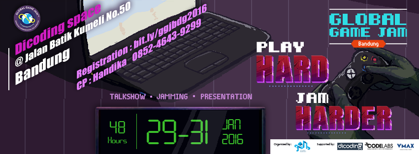Untuk temen-temen di Bandung, sekarang sudah bisa mendaftarkan diri di bit.ly/ggjbdg2016 untuk bisa ikut berpartisipasi. Peserta dibatasi hanya 50 orang dan bisa diikuti oleh temen-temen dari berbagai latar belakang, entah itu programmer, artist, composer, game designer, story teller, dll. Acaranya diadakan di Dicoding Space, Batik Kumeli no 50. Sponsornya juga kece-kece, ada Dicoding dan VMAX, dibantu juga oleh CodeLabs Unikom.