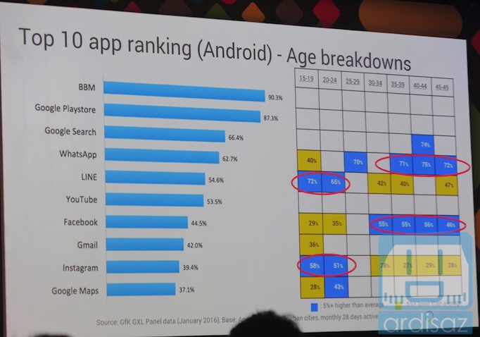 Data menarik lainnya yang dibagikan oleh Google adlaah perilaku pengguna smartphone, terutama di Indonesia. Ada berbagai data menarik yang bisa kita gunakan untuk mengenal dan mengidentifikasi pengguna kita. Salah satunya kita bisa lihat dari sisi top aplikasi yang diunduh di Indonesia. Yang menarik, BBM masih juara satu. Masih ada kah pembaca di sini yang pakai BBM? Kalau ada, apa alasannya kalau boleh di-share di kolom komentar yah. Lalu bisa dilihat juga demografi Whatsapp vs Line dan Facebook vs Instagram. Keliatan kalau ada aplikasi yang lebih disenangi oleh anak muda dan ada yang lebih disenangi oleh orang dewasa.