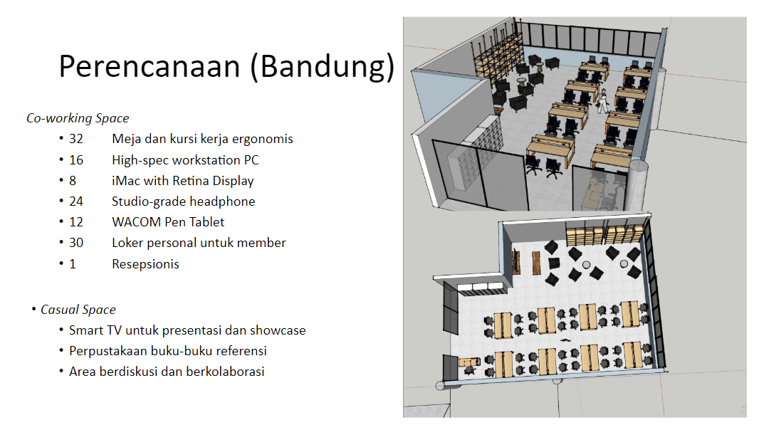 Untuk mengajukan Banper, kami perlu membuat Rancangan Anggaran Belanja (RAB) untuk tiga hal yakni renovasi tempat, pengadaan furniture dan tools pendukung, dan pengadaan TIK. Kemudian ada segunung dokumen administratif yang perlu kami siapkan mulai dari administratif AGI, administratif lokasi tempat coworking spacenya nanti, dan lain-lain. Lalu kami juga perlu membuat gambar plan sitenya akan seperti apa. Ini Cipto belajar kebut semalam pakai software 3D untuk bikin gambar plan dari space yang ingin kita buat. Kami pun menamai coworking space milik AGI ini dengan nama Ruang Aksi Game Indonesia (RAGI). Nama RAGI dipilih karena Cipto suka makan roti harapannya agar coworking ini bisa menjadi seperti ragi, yang dapat membuat roti yang tadinya kecil jadi mengembang, RAGI bisa membuat studio-studio kecil di Bandung berkembang kualitasnya.