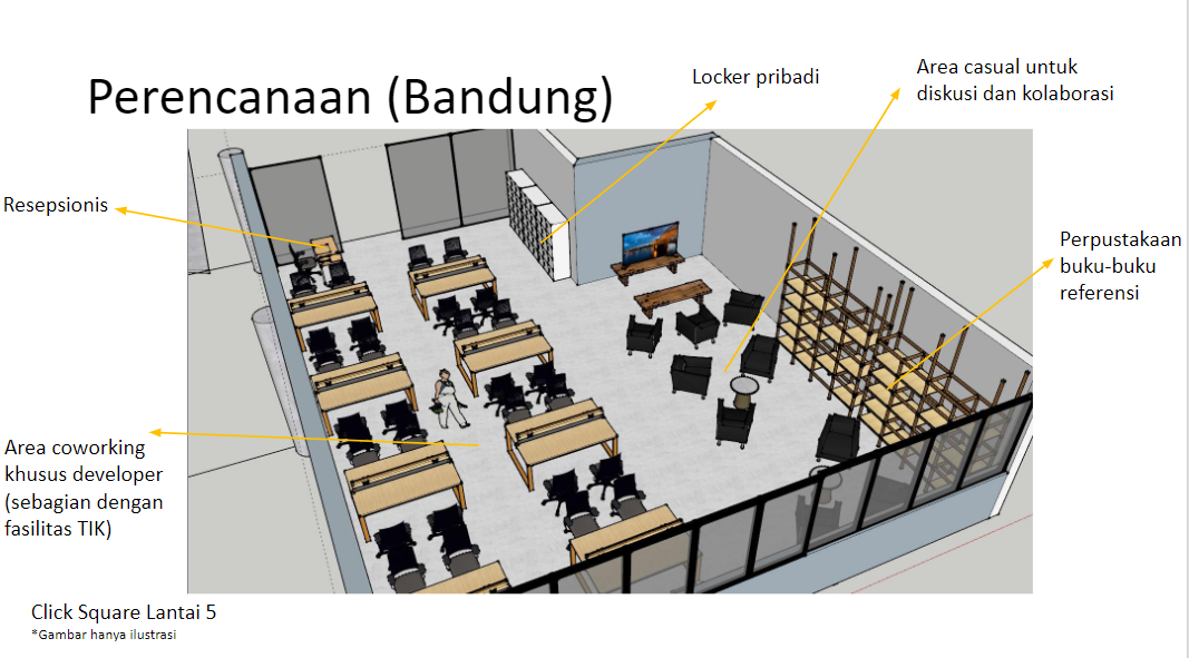 Hal pertama yang kami lakukan adalah mencari spot untuk dijadikan coworking space kami dan merancang kebutuhan anggaran. Di proses ini, kebetulan saya belum banyak terlibat. Pencarian lokasi dan penganggaran dilakukan oleh Cipto. Konsep awal yang dibuat untuk coworking space ini adalah sebuah ruangan dengan kapasitas sekitar 50 orang dimana setengah kursi memiliki high end PC/Mac untuk menunjang kebutuhan rendering ataupun compiling dan sisanya untuk mereka yang sudah punya working tools sendiri dan hanya membutuhkan ruang kerja. Jadi untuk tempat, kami perlu mencari space yang bisa disewa dengan harga terjangkau atau gratis dimana sebagai imbal baliknya, proses renovasi space tersebut dan pengadaan furnitur akan dibiayai oleh Banper. Setelah pencarian, akhirnya kami mendapatkan kontak bahwa Clicksquare berencana membuat coworking space dan tertarik bekerjasama dengan AGI untuk membuat coworking space khusus game yang disupport oleh Banper. Kami sangat excited dengan tawaran dari Clicksquare yang mau memfasilitasi komunitas game di Bandung dan berharap rencana ini bisa terwujud. Proses diskusi dengan ownernya sudah dilakukan dan kami memiliki visi yang sama ingin menghidupkan komunitas. Format mall Clicksquare pun sangat community friendly dengan banyak tenant-tenant yang berasal dari komunitas dan UMKM.