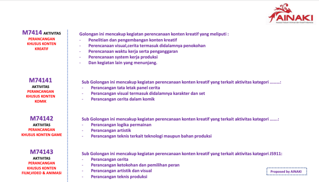 Oke berikutnya saya mau nambahin sedikit karena ada usulan yang cukup menarik untuk kita bahas bareng-bareng nih. Usulan ini disampaikan oleh Asosiasi Animasi (AINAKI). AINAKI mengusulkan untuk membuat “rumah” baru untuk industri ekonomi kreatif di kode M (Aktivitas Perncangan) di kode 741 untuk Aktivitas Perancangan Khusus.