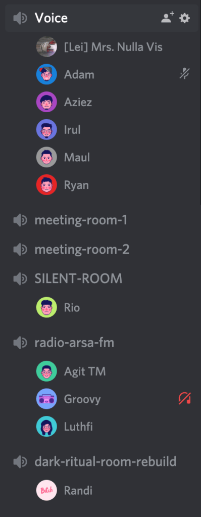 Lalu gimana buat orang-orang yang kalau kerja harus tenang? Di sinilah peran channel dimaksimalkan. Jadi ada channel untuk standby dan siap mendengar celotehan2 ringan, ada meeting room yang dipakai untuk diskusi intensif terkait suatu isu, ada juga silent room buat mereka yang gak mau diganggu suara, bahkan ada juga channel radio dimana kita bisa request lagu dan dengerin playlist temen-temen di Discord. Ada juga voice channel buat temen-temen yang lagi intern supaya bisa diskusi dan ngobrol sendiri dengan nyaman.