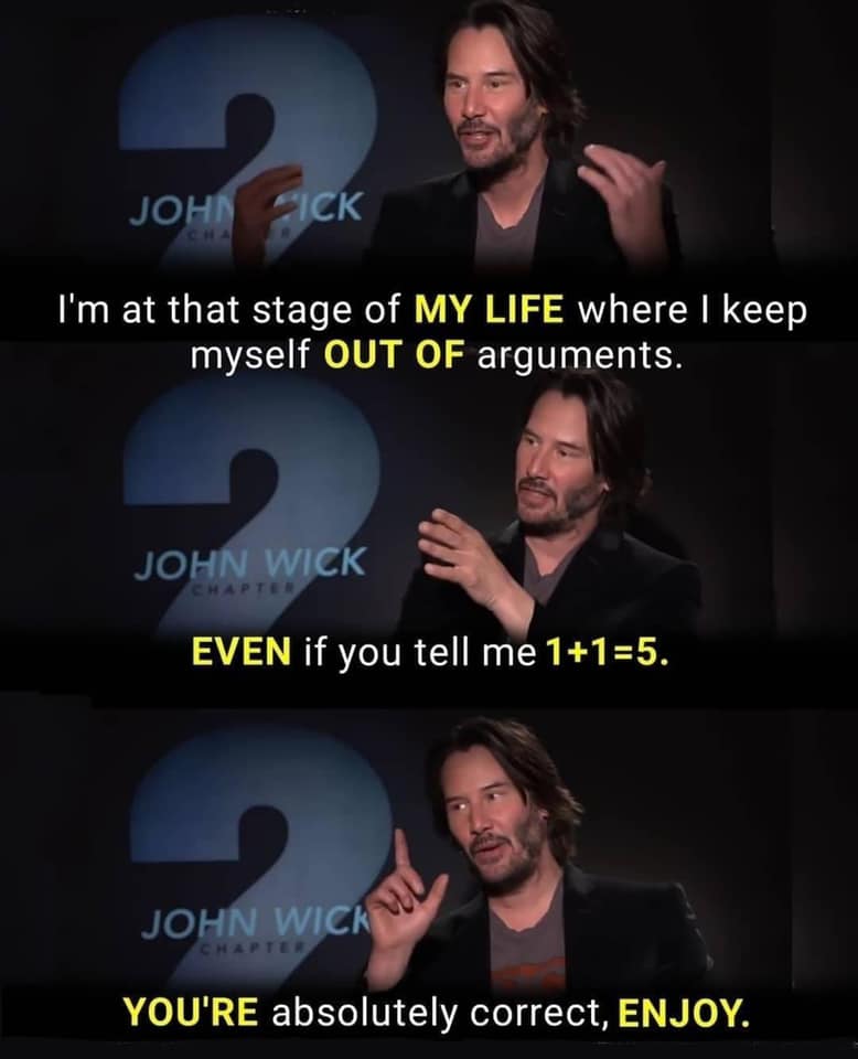 Saya sendiri sudah mulai menghindari perdebatan di sosial media karena tahu klo di sosmed ini mau berbusa kayak apa, gak akan bisa ketemu titik tengahnya. Klo emang mau diskusi, ya mending ketemu langsung. Dan kebetulan lihat ada postingan keanu reeves yang sangat related. Dia bilang kalau dia sudah dalam fase hidup dimana tidak mau argumen sama orang. Bahkan klo ada orang bilang 1+1 = 5, ya udah selamat. Karena emang lebih banyak ngabisin energi dan buang-buang waktu.