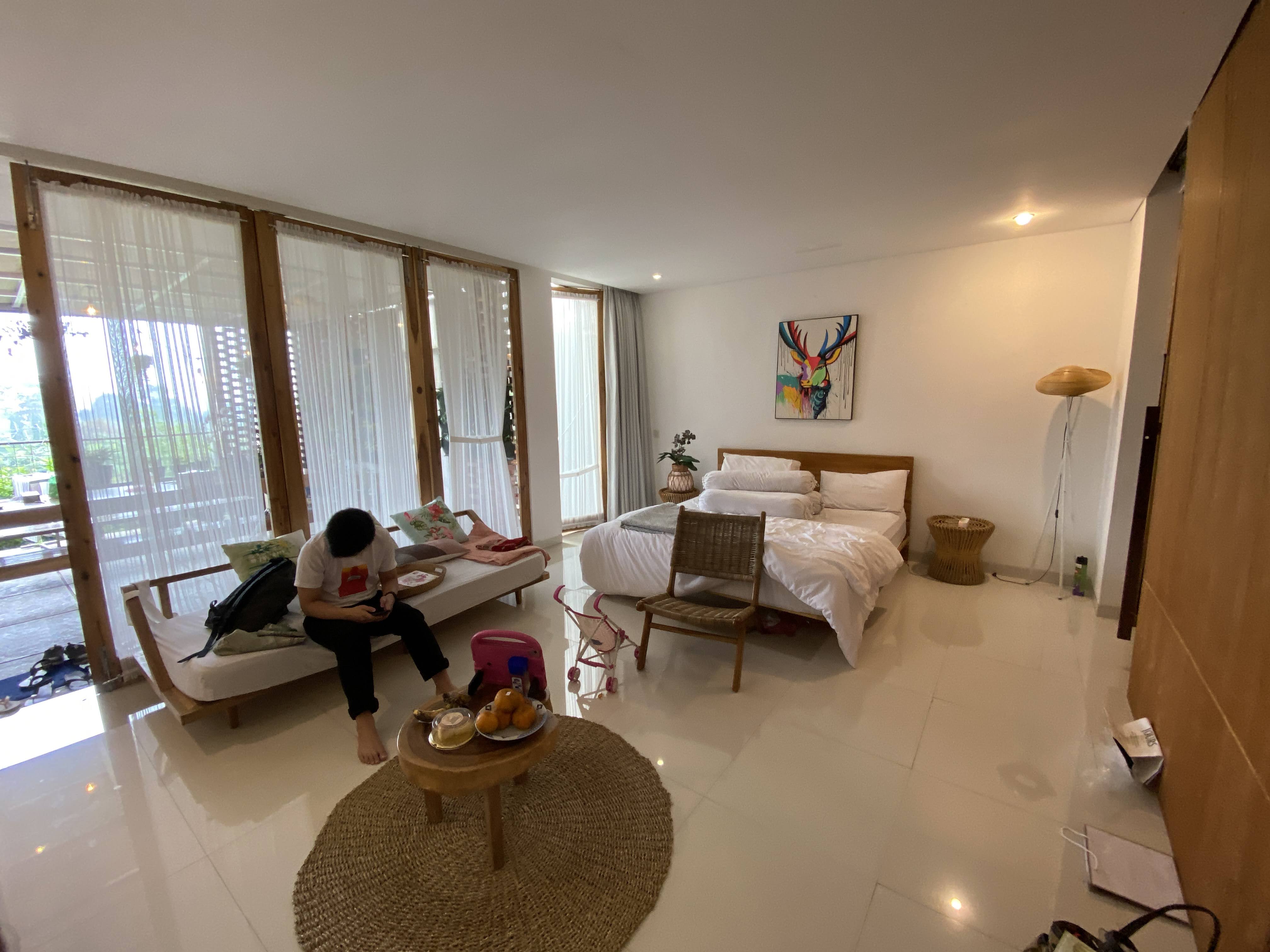 Teras yang luas, area dining semi outdoor, dan jacuzzi outdoor jadi nilai paling menarik dari villa ini. Sisanya ada satu bedroom dengan queen size yang ada connecting door ke kamar mandi. Kamar mandi ini juga bisa diakses dari living room yang lumayan besar. Di living room ada sofa bed dan ada king size bed juga. Lalu ada dapur yang lengkap juga di samping living room. Kamar mandinya ada satu, pakai shower. Tapi air angetnya mati nyala gitu. jadi klo lagi mandi, kadang airnya tiba-tiba jadi dingin. Tahu sendiri kan lembang dinginnya kayak apa hahaha.
