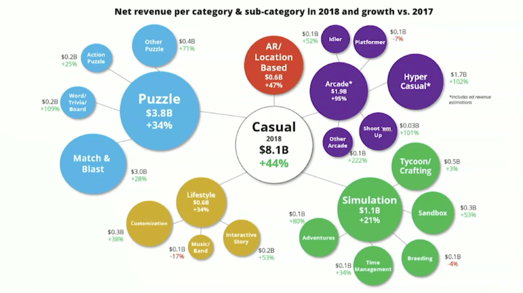 Sedikit sejarah idle, saya gak tahu temen-temen dulu pernah tahu ada game judulnya cookie clicker gak? Dulu kayaknya di 2011an gitu, salah satu tim di Arsanesia ada yang suka banget dengan game itu dan ngusulin kita bikin game idle clicker kayak gitu. Tapi kita dulu gak tahu yah potensi game idle jadi gak berminat juga bikinnya. Lalu semakin ke sini, game-game idle gitu makin rame di pasar. Ada adventure capitalist, ada tap titan, ada farm away, dan lain-lain. Ini merupakan salah satu genre yang dari 2017 ke 2018 kenaikannya sangat drastis di dalam genre casual game. Bisa cek gambar di bawah ya, revenue di kategori idle itu walopun ukurannya kecil, tapi kenaikannya sangat signifikan.