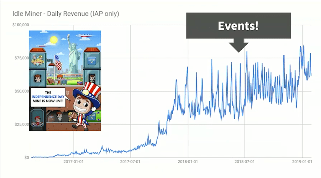 Nah ini nih yang paling krusial dari semua game dengan model freemium atau free2play. LIVE OPS. Gimana caranya kita bisa dengerin feedback dari user dan merespon feedback tersebut secara rutin. Tujuh bulan awal, game Idle Miner Tycoon ini performnya biasa aja. Bagus sih, tapi yang gak fenomenal. Lalu tiba lah mereka mengeluarkan update ada fitur ekspedisi yang ada sedikit elemen multiplayernya. Terus setelah itu mereka mulai rutin merilis event-event kayak haloween, independence day, dll yang mudah karena tinggal milih arena bermain baru yang efeknya serupa kayak prestiging yah. Coba liat grafik di bawah, ketika ada event, revenue perharinya jadi gak masuk akal.