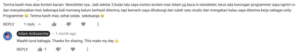 Balik lagi, impian ku gak pernah untuk supaya terkenal dan banyak subrcibernya. Impian ku adalah bisa memberikan manfaat. Aku cukup terharu di video newsletter ku yang ke berapa gitu, ada yang komen, gara-gara dia ngikutin newsletter itu, sekarang dia jadi dapat kerja. :’) Hal-hal kayak gitu yang memberikan fulfilment buat aku. Terus ketika membedah game, bisa ada ilmu baru yang aku pelajari dan orang lain pelajari. Segmen itu pun jadi medium buat temen-temen gamedev bercerita proses pengembangan gamenya.