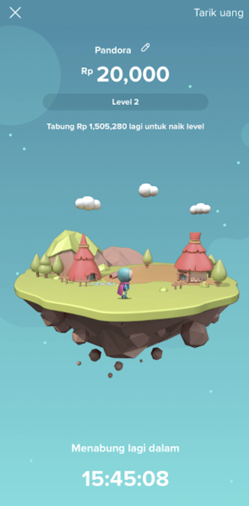 Jadi cara bermainnya adalah kita akan diberi satu pulau. Di pulau tersebut ada bangunan dan ada karakter yang bergerak. Di awal, kita diminta untuk memberi nama “city” yang mau kita bangun. Ini menurut saya fitur gamifikasi yang lumayan nice karena kita akan lebih punya attachment terhadap something yang kita beri nama. Jadi ini bisa mendrive motivasi kita untuk melakukan aktivitas menabung.