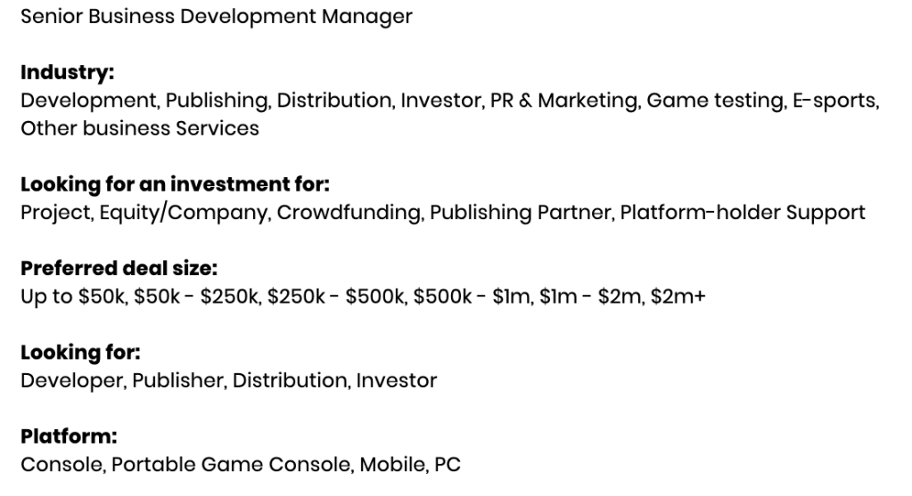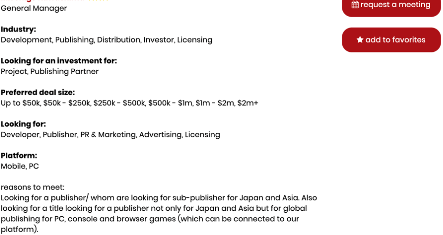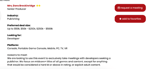 Terus kalau yang gak bisa pergi ke event luar negeri gimana? Karena pandemi, semua event jadi online. Ini kesempatan. Tapi gak hanya itu, Kemenperin dan Kominfo coba manggil publisher2 game di luar ini untuk dateng ke Indonesia. Kemenperin punya program BizMatchmaking dan Kominfo bersama AGi punya program IGDX. IGDX masih nanti di November, tapi yang BizMatchmaking, wow itu keren banget sih publisher-publisher yang dateng. ada hampir 50 publisher/investor yang datang dan kalau diklik di profile mereka, ditulis tuh mereka looking for game dengan budget berapa. Ada yang nyari budget up to 50kUSD, 50-250k USD, 250k-1jt USD, dll. Itu ada banyaaakk banget. Dan perlu diperhatikan juga yah, mereka nyari game kayak apa. Ada yang nyari game mobile, game pc, game horor, dan lain-lain.