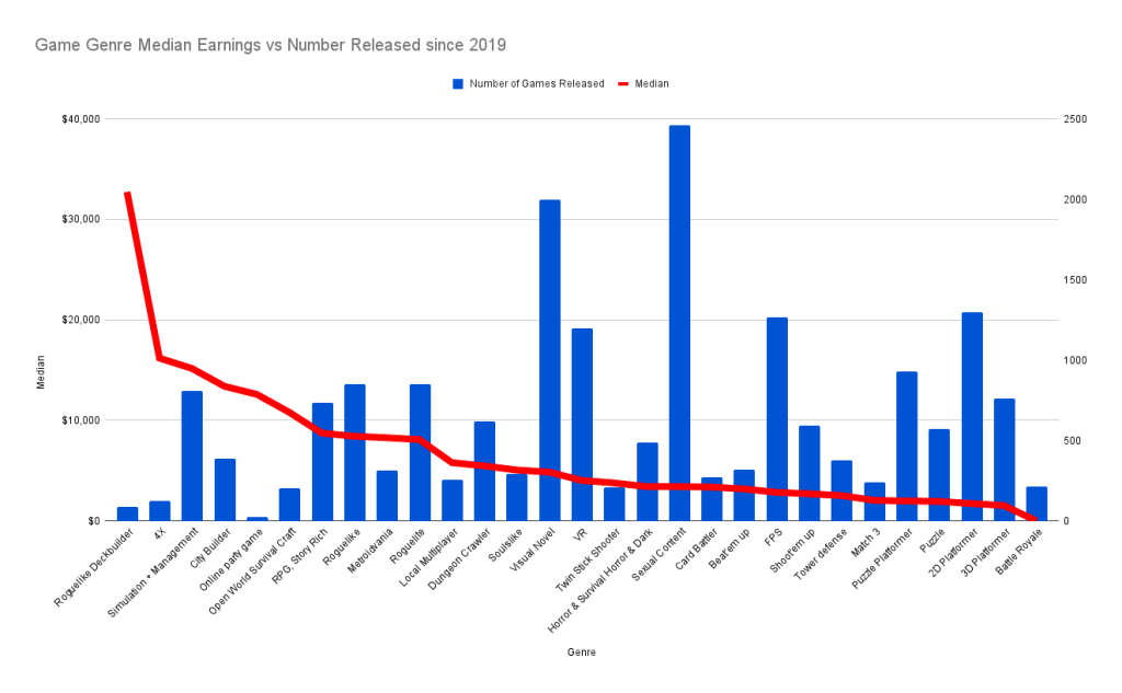Cara bacanya gimana? Garis merah adalah median rata-rata revenue yang didapatkan oleh game dengan genre tertentu. Biru adalah jumlah game yang released di 2019-2022 di genre tertentu. Nah yang menarik di sini adalah kamu bisa liat genre “Rougelike Deckbuilder” kayak Slay The Spire adalah underserved market dimana median game-nya sukses mendapatkan earning di atas 20.000 dolar. Genre yang masih underserved dengan potensi yang gede lainnya adalah game 4X kayak Civilization, Builder game kayak Timerborn, dan Survival Craft kayak Valheim. Terus kalau kamu liat, genre yang paling tidak berhasil membuat indie sukses adalah game platformer, puzzle game, dan FPS. Jadi kalau kamu bikin di area yang biru nya tinggi, misal Visual Novel, Puzzle Platformer, FPS, atau 2D platformer, kamu akan bersaing dengan banyak sekali judul akan rilis bersamaan dengan game kamu. Bukan berarti gak boleh, tapi Unique Selling Point dan juga Marketing Strategy dari game kamu harus bener-bener kuat.