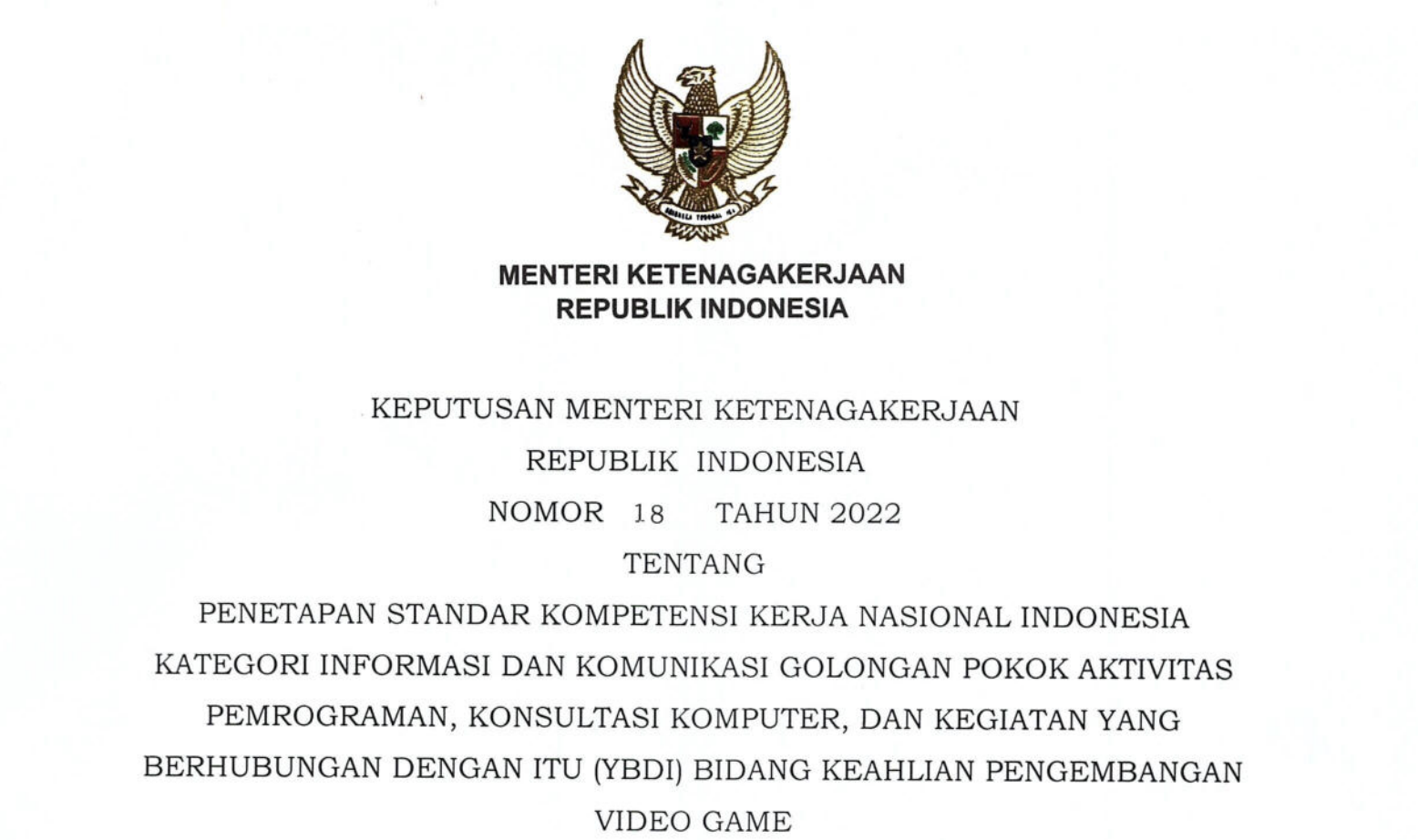 SKKNI untuk Game Development telah usulkan melalui support Kominfo yang selanjutnya dirumuskan oleh pelaku industri dan juga akademisi di tahun 2021, dan disahkan oleh kemenaker di 25 Februari 2022. Kebetulan saat itu saya yang bertugas sebagai ketua tim perumus dari SKKNI Game Development. Kalau mau baca-baca, bisa cek di sini. Dan saat ini, SKKNI tersebut lagi diiterasi lagi agar bisa lebih presisi dan mengikuti kondisi di lapangan terkini.